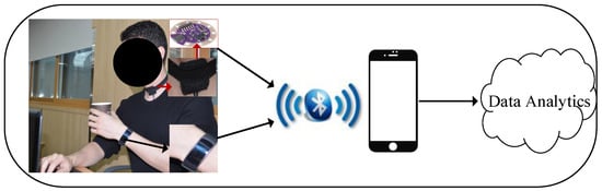 The wearable sensors employed in this work perform the data collection and wireless data transmission to a smartphone. Body acceleration and angular movement were recorded with motion sensors present in the smartwatch. Neck skin movements were captured by a piezoelectric sensor embedded into the necklace. The smartwatch and the necklace communicate with the app running on the smartphone through Bluetooth, as shown in Figure 1. The app transmits the received data to a cloud server for data analytics at a sampling frequency () of 20 samples/second.