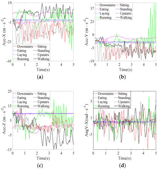 Data stored in cloud server are processed offline in MATLAB2017b. The architecture of the proposed wearable sensors system is shown in Figure 1. The signals of the piezoelectric sensor and motion sensors during different activities are shown in Figure 2.