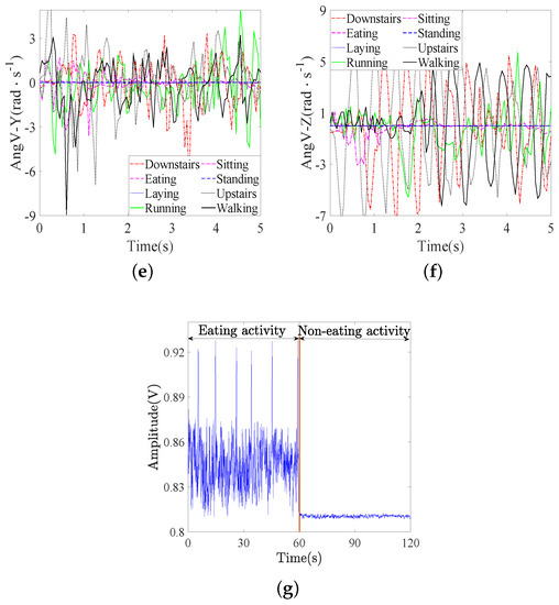 The signals of accelerometers, gyroscope, and piezoelectric sensor: (a–c) acceleration in (xyz) axes; (d–f) angular velocity in (xyz) axes; and (g) the piezoelectric sensor signal.