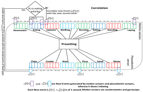 The working principle of an ESS approach is shown in Figure 3. This approach of signal segmentation requires only a segment of each physical activity and food category. Each already saved segment consists of five events. Therefore, five events of motion sensors signal for eight different activities and five events of the piezoelectric sensor for six food categories are saved in Presetting stage. ESS correlated each remaining unlabeled event containing motion sensors signal with each already saved segment (i.e., motion sensors signal) of different activities. The label is assigned to an unlabeled event based on an outcome of its correlation with the saved segments of the activities. An unlabeled event () attains a vote if it is correlated to the event of the segment of particular activity higher than the reference threshold (i.e., ). This way, is correlated to the segment of each activity five times. We set an odd number of events in each segment of the activities because these events help to annotate the with a particular label. The annotation is done based on majority voting results of correlation between and the already saved segments of the activities. Thus, all s of data carrying information about the activities are annotated. An annotated with eating activity triggers the annotation process for the of piezoelectric sensor signal because food categories are sub-classes of eating activity. Similar to the annotation of the activities data, all s of the data carrying piezoelectric sensor signals for food categories are annotated.
