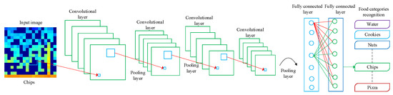 Bi et al. developed embedded hardware named as AutoDietary for food intake recognition, which consists of a throat microphone and a smartphone application [23]. A throat microphone is worn on the neck of the subject for collecting acoustic signals non-invasively while eating any food. AutoDietary classifies seven food categories in addition to the binary classes of solid and liquid with an accuracy of 84.9% and 99.7%. AutoDietary has performed well in classifying the broad range of categories with enough accuracy in the laboratory setting. However, the accuracy of such a system based on the microphone can drastically decrease in the real environment because surrounding noise can interfere with the sound of food intake. Alshurafa et al. also designed a wearable system for nutrition monitoring that was in the form of necklace embedded with a piezoelectric sensor for detecting skin motion in lower trachea during ingestion [28]. Their method classifies foods in few classes such as solid and liquid, hot and cold, and hard and soft using statistical features collected from spectrogram.