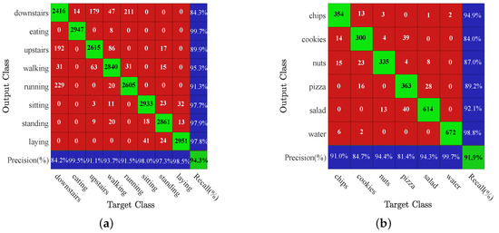 Figure 6 shows the recognition performance of our proposed system using SVM and CNN. It is observed is Figure 6a that eating is recognized with higher accuracy than other activities because of forearm movement while eating causes the sensors to generate a distinct pattern (see Figure 6a). Downstairs attained the lowest accuracy and most of its segments are incorrectly classified as the physical movement involved for running and going downstairs is related to some extent. For example, the gravitational force accelerates the movement of subjects by applying a force downward when they perform a downstairs activity. The walking speed is increased when the subjects go downstairs owing to the natural phenomenon of gravity. Therefore, there is a possibility that the participants while performing a downstairs activity prefer natural movement (i.e., increased speed) rather than applying anti-force to cancel the effect of force pulling downward. For food classes, Alexnet recognized water with the highest accuracy and cookie with the lowest accuracy (see Figure 6b). Being a liquid, ingestion pattern of water is quite different from other food classes, whereas cookie might have exhibited a pattern resembling those of other classes.