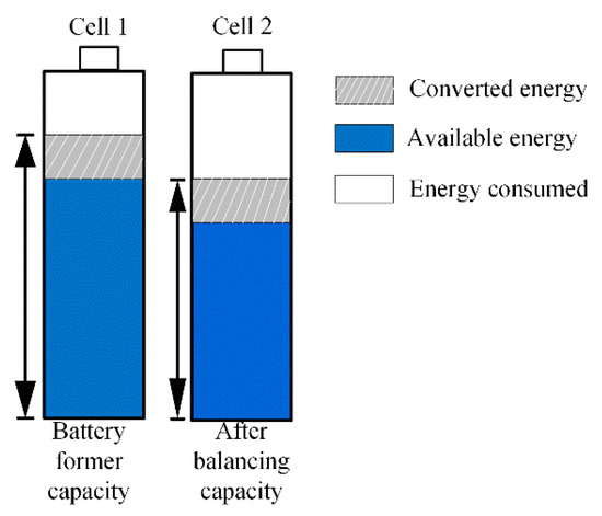 Lithium-ion batteries have been widely used in the field of electric vehicles due to their high charging–discharging times and high energy efficiency. Since the battery pack in a pure electric vehicle is connected in series and in parallel through a large number of battery cells, some of the battery cells may be unbalanced during the continuous charging and discharging process of the battery. The overall performance of the battery pack will be restricted by the battery cells with the lowest battery capacity, which will seriously affect the service life of the battery pack and reduce the battery life of the electric vehicle [1,2]. Battery equalization technology can suppress imbalance in the battery pack, leading to improved work consistency. The battery management system is able to operate well, which can ensure safe driving of new energy vehicles, and the working principle is shown in Figure 1. Excess energy (Converted Energy in the legend) can be transferred from cell 1 to cell 2 through the energy converter. A relatively balanced state is achieved between the two cells, and so on, resulting in consistent energy obtained by the entire battery pack.