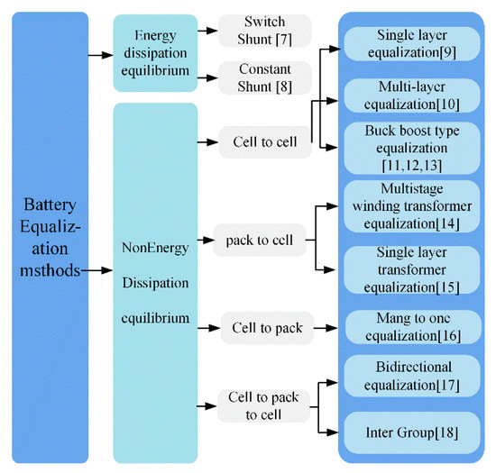 In recent years, plenty of battery pack equalization methods have been proposed [3,4,5,6]. The equalization method has been divided into different categories according to various criteria. The energy dissipation has two types [7,8]: switch shunt and fixed shunt. This equalization circuit with a simple structure was easy to control. However, the converted heat will result in increased temperature in the entire battery pack, and the system will require extra energy. Compared with the energy dissipation type, a peripheral energy conversion circuit was applied to balance the voltage of the battery through the non-energy dissipation equalization method. Although the circuit is more complex, it is more efficient and safe according to the different means of energy transmission. These methods are further subdivided into four types: cell-to-cell equalization methods, cell-to-pack equalization methods, pack-to-cell equalization methods, and cell-to-pack to cell equalization methods, as shown in Figure 2.