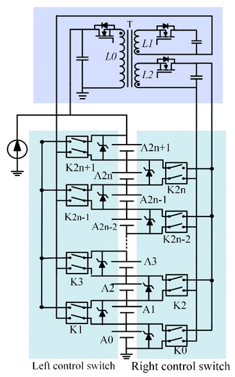 The equilibrium method proposed in this paper could be extended from the original single-to-single equilibrium to the multi-to-two equilibrium structure. The staggered switching network is combined with the two operation modes. Bidirectional equalization is realized in the energy-transfer process as shown in Figure 4. The left and right sides are staggered control switches by the application of a two-winding flyback transformer for output isolation. The bidirectional equalization equivalent circuit is shown in Figure 5.
