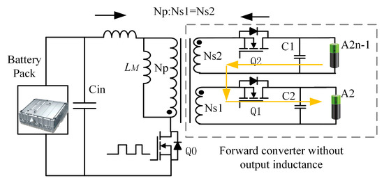 When the energy difference between the individual cells in the battery pack is large, and the equalization mode will adopt forward operation mode, the cell can be directly connected to the A2N−1 and A2 windings on the output side for fast equalization.