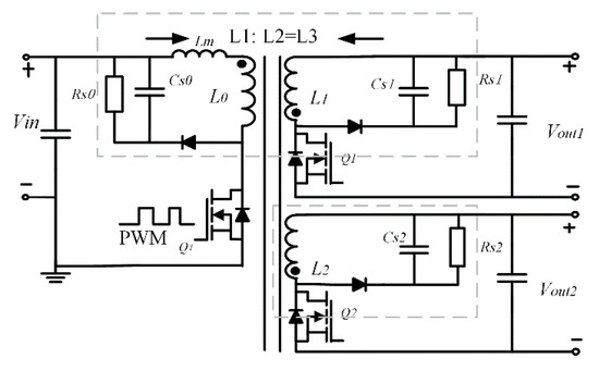 The following circuit workings in detail were defined as follows: the leakage inductance of the multi-winding transformer is Lk, the magnetizing inductance denotes Lm. In the primary winding of the transformer, the voltage at the input port is VL0, the output port voltage is VL1 and VL2.
