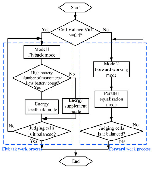 The new voltage equalization structure was proposed in this paper. During the process of equalizing the battery pack, it is necessary to control the DC–DC converter in different operating modes. This can become an essential basis for working mode matching by the amount of cell voltage difference. Meanwhile, the corresponding control method was adopted to control the equalization switch network. The balancing strategy is shown in Figure 9. The strategy of equalization control should pay attention to the following points: