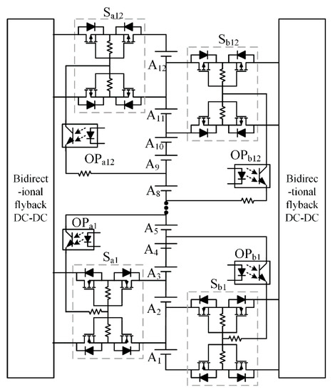 In the new voltage equalization system, real-time acquisition and analysis for parameters of battery voltage and temperature parameters were performed by the main controller and voltage detection chip LTC6803. Different equalization modes are selected according to the number of unbalanced monomers, thus the equalization control was efficiently implemented. The switch array has a function of selecting a path, and the battery cells are connected to the double-winding flyback isolating converter by the switches on the left and right sides. The switch consists of a bidirectional MOS (Metal-Oxide-Semiconductor) tube. The six cells A1, A2, A3, A4, A5 and A6 at the bottom of the pool group are connected to the N-MOS (N-Metal-Oxide-Semiconductor) switch tube respectively. The left battery cells A7–A12 are connected to the P-MOS (P-Metal-Oxide-Semiconductor) switch tube, the specific working circuit is shown in Figure 11. The battery cell is connected to the switch tube through the optocoupler, the switch is connected to the gate of four MOS transistors, the first four switches of the battery pack are Sa12, Sb12, Sa11, Sb11, the gate of each set of switches is connected to the c-pole of the phototransistor in the optocoupler, the e pole is connected to the negative electrode of the battery cell, which possessed the lower three positions of the battery cell. For example, the switch corresponding to the battery unit A12 is Sa12. The gate of the four PMOS transistors is connected to the c pole of the optocoupler OPa12, and the e pole is connected to the negative electrode of the battery unit A9. The switch corresponding to the A1 battery cell is OPb1 on the right side in the switch array, the gates of the four N-MOS transistors are connected to the e-pole of the optocoupler OPb. The c pole is connected to the battery cell A4. The connection method is the same as the above discussion when the control switches of the remaining battery units are applied. An additional complicated switch drive circuit is not required for the structure, the driving voltage of MOS is directly provided by the battery pack, the optocoupler is connected to the left and right switch arrays for signal control, which acts as a signal isolation function, the battery structure is simple and efficient.