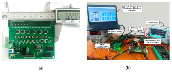 To verify the performance of the proposed voltage equalizer, a prototype was built and tested. Figure 13 shows a photograph of the experimental prototype and associated instruments. The experiment uses a “DELI PU BATTERY” 18650 Li-ion Battery with a capacity of 2800-mAh, a rated voltage of 3.7 V, a discharge cut-off voltage of 2.75 V, and an equivalent series resistance of 80 mΩ. The standard charging voltage is 0.5 C (1400 mA), the operating temperature is 0–45 °C in the state of charge, and the discharge state is −(20–60) °C. the battery pack consists of 12 batteries of 2800-mAh battery strings which can store 10.36 Ah and 124.32 Wh. When the experiment is carried out, the voltage detection frequency is 50 Hz. The switching frequency of the left and right switches is 1 Hz, the operating frequency of the bidirectional winding flyback converter is 25 kHz and the voltage difference between the beginning and the ending equalization is 30 mV.