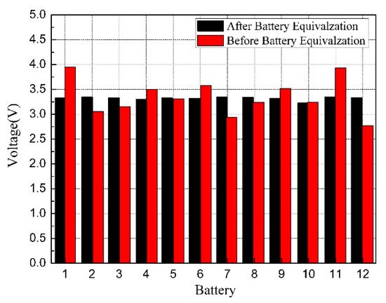 Figure 16 shows the voltage distribution before and after the battery voltage equalization. The horizontal axis represents different monomers and the vertical axis denotes the cell voltage. It can be noted clearly that the voltage of each cell in the battery pack is unbalanced. The voltages tend to be consistent upon equalization, which indicates that the new voltage equalization structure can effectively realize the function of voltage equalization.