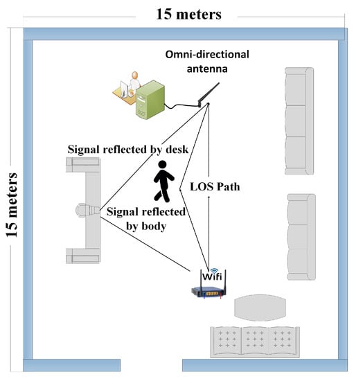 The experimental indoor setup for FOG detection is illustrated in Figure 2. The indoor setup is based in a room of size (15 m × 15 m) at Xidian University, China. The transmitter (Tx) is a WiFi router placed 10 m apart, in the line of sight of the receiver (Rx). The Rx consists of an omnidirectional antenna connected to a commercial Intel 5300 network adapter installed in the PCIe slot of an HP desktop computer, equipped with Ubuntu 14.1 and 4 GB RAM. The Tx works at 4.8 GHz in C-band and generates RF signals with multiple frequencies. The frequency is part of the 5G spectrum in China and is an essential part of the official 5G communication standards in China []. In addition, the Internet of Things (IoT) for 5G network primarily use the specific frequency band as well. The receiver side antenna also works with the similar frequency band. These signals are received by RX and the CSI variations are passed onto the desktop for processing. A total number of 15 volunteers took part in the experiments after obtaining ethical approval and were asked to perform four activities of daily life, during which the freezing of gate episodes were captured. This work takes into account five activities namely, walking fast, walking slow, sit–stand, voluntary stops, and FOG. The ground truth for FOG was the patient assertion of experiencing the FOG episode, the remaining activities were randomized over different subjects, and the instruction and subsequent observation of a particular activity was used as the ground truth. The activities affect the wireless medium and the perturbations in CSI values are captured and used for discrimination of FOG episodes from ADLs.