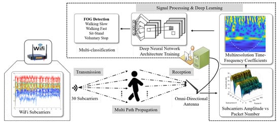 The proposed WiFreeze system architecture is illustrated in Figure 3 and solves a multi-classification problem of FOG detection and recognition of various ADLs. The system consists of a WiFi router, which transmits data using OFDM comprised of 30 subcarriers. The CSI amplitudes and phase of the subcarriers are affected by the human movements in the environment under test. The receiver receives the amplitude perturbations for each subcarrier at the granularity of packets and corresponding time values. Each of the subcarrier amplitudes are processed for feature extraction. A multiresolution time-frequency scalogram is computed with the continuous wavelet transform, and the time-frequency patterns are used as an image object for classification of FOG and ADLs. Transfer learning is performed on a very deep CNN with scalogram images as inputs for detection of FOG and ADLs.