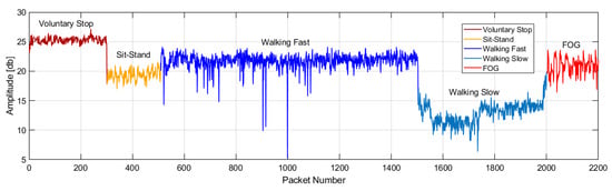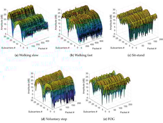 The CSI amplitudes [dB] were obtained from the Intel 5300 NIC connected to the omnidirectional antennae receiver. CSI measurements in our work refer to CSI amplitudes, as phase values were not used due to their highly random nature. Figure 4 shows CSI values for an arbitrary sequence of movements, as the activities were randomized over different subjects. Furthermore, the CSI measurements for FOG and different ADLs exhibit distinguishable variations in the amplitudes of subcarriers, with the number of packets as illustrated in Figure 5. The CSI measurements also change with the subcarriers (frequency) as illustrated in Figure 5, amplitude [dB] versus subcarriers plot. Overall, Figure 5 illustrates significant changes in CSI measurements across number of packets (time) and subcarrier numbers (frequency) for different ADLs and FOG. Note that the CSI measurements show distinguishable changes between FOG and voluntary stop despite similarities in both movements, as illustrated in Figure 5e,d, respectively.