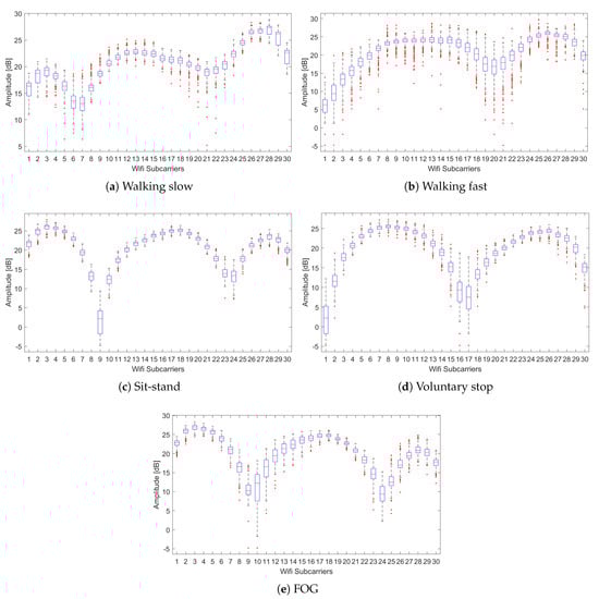 The box plots for the CSI measurements versus subcarriers are also illustrated in Figure 6, which show first quartile , median , third quartile , interquartile range , minimum value , and maximum values , as given in Equations (5)–(10), respectively. The CSI values below the lower limit and above the upper limit are outliers, denoted as red dots in the box plot shown in Figure 6. The box plots for CSI measurements provide statistical information about the amplitude of variations along 30 subcarriers. It is quite clear from the box plots that statistical information of a single subcarrier such as median, quartiles, and interquartile ranges are not sufficient to distinguish between various activities and FOG. The available statistical information of various subcarriers may be same across different activities, such as subcarriers 13, 14, and 15 in Figure 6a,c, have similar median and quartile values. Similarly, subcarriers 9 and 10 in Figure 6c,d provide same statistical information. In the next section, we describe signal processing technique for feature extraction, which can be applied to a single carrier to obtain features for classification of FOG and ADLs.