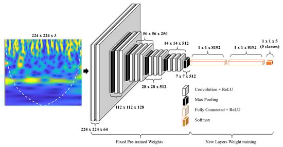 The proposed very deep CNN architecture is engineered from an existing VGG-16 architecture [] and is illustrated in Figure 8 with each layer size. The VGG-16 [] architecture is pretrained on the imagenet [] database for object identification. The layers of the proposed network VGG-8K consist of 13 convolutional layers, five maximum pool layers, one global average pooling, two Fully Connected (FC) layers at the output with 8192 neurons each, and a Softmax layer with five classes, as illustrated in Figure 9. The neural network is called VGG-8K as it has 8000 neurons in each FC layer. The convolutional layers of the proposed network use the pretrained weights of VGG-16 [], whereas the FC and Softmax layers are trained by transfer learning on the scalograms of all subcarriers for the FOG and activities data set.