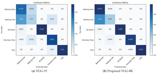 The second-best performing deep network is the VGG-19 [] with 93% FOG detection accuracy, followed by VGG-16 [] with 91% accuracy, whereas overall multi-class accuracies are 75.3% and 70.8%, respectively. ResNet-50 [] and ResNet-101 [] gave lower accuracies of 67% and 54%, respectively, as illustrated in Table 1. The normalized confusion matrix of the proposed network is compared with VGG-19 [], which has the second-best accuracy in Figure 10. The confusion matrix shows that FOG is misclassified as voluntary stop 0.3% of the time in VGG-8K and 0.7% of the time in VGG-19 []. This is because the two movements are quite similar, and, despite this, the proposed system performs very well in detecting FOG. Furthermore, the accuracies of Walking Slow, Sit–Stand, and Voluntary Stop are above 94%, whereas recognition of “walking fast” is poor at 35%, as it is misclassified as “walking slow” 65% of the time. This is because walking fast or slow are relative terms for subjects under test and fast walk of one subject that can easily be construed as slow walk of another subject by the classifier. However, the aim of this research is to detect FOG from ADLs and the system performs very well in differentiating against all tested activities including walking.