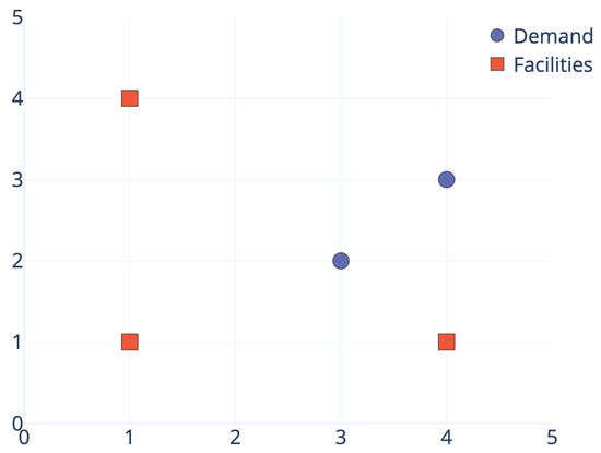 Facility location is a family of hard optimization problems that have been in the spotlight of the scientific community in the last few years, not only from a theoretical point of view, but also from practitioners in this field [1,2]. Given a set of candidate locations N representing demand points, the goal of this kind of problem is to select a subset of p locations, , that will host a facility, with the aim of minimizing or maximizing a certain criterion. Demand points (representing customers, patients, students, etc.) will require some kind of services from the facilities (i.e., shopping centers, hospitals, schools, etc.) [3]. Among the most extended criteria are the maximization of dispersion among facilities, which was originally defined in [4], and it has been recently studied in [5], the minimization of the distance between the demand points and their closest facility, defined in [6] and tackled with a totally novel approach in [7], or even the minimization of the distance between the demand points to their closest facility and their second closest facility with the aim of being able to overcome a facility failure. This problem was recently presented and solved with an exact approach [8], but it has also been studied from a heuristic point of view [9].