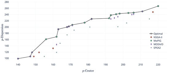 The results were divided into two parts: preliminary and final experimentation. In the preliminary experiments, the contribution of each step of the proposed algorithm was checked and, thus, the parameters involved. The quality of the obtained results was measured comparing them with the optimal Pareto front, which can be obtained by using the -constraint algorithm proposed in [23]. The computing time required by the -constraint algorithm made it unaffordable to be considered in real scenarios, where the time required to generate a solution was a relevant parameter. Therefore, we also included the results provided by an efficient implementation of evolutionary algorithms used in facility location problems: NSGA-II, MOEA/D, and the Strength Pareto Evolutionary Algorithm 2 (SPEA2).
