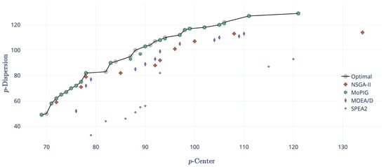 Sets of non-dominated solutions obtained by NSGA-II, -constraint, SPEA2, MOEA/D, and MoPIG for instance pmed4, with and .