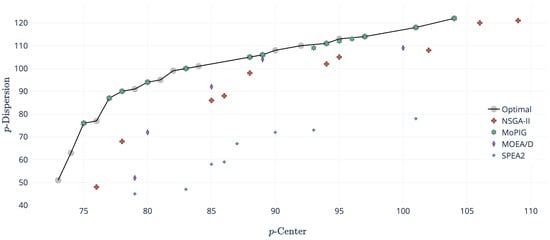 where P consists of the facilities included in the partial solution so far. The parameter controls the weight given to each objective function. On the one hand, values close to zero result in optimizing the p-dispersion problem. On the other hand, values close to one optimize the p-center value. The values considered in this construction are: 0.00, to optimize ; 0.25, to focus on , but slightly taking into account ; 0.50, to balance and ; 0.75, to focus on , but slightly taking into account ; and 1.00, to optimize . The constructions are applied in this way with the aim of covering the full spectrum of values and get a diverse initial approximation front.