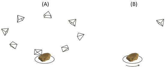(A) multi-viewpoint camera approach for photogrammetric acquisition of a fixed artefact; (B) the rotary photogrammetric approach, achieving the same image set with a fixed camera and moving turntable.