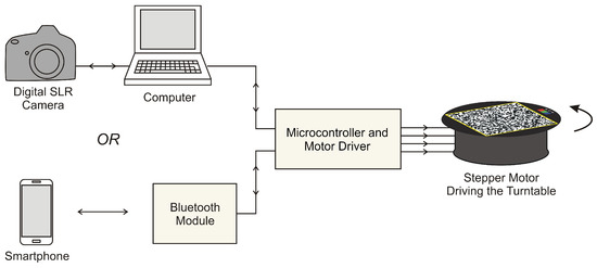 Smartphone control required a similar acquisition application to be developed using the Android Studio Integrated Development Environment (IDE) (Version 2.2, Google LLC, Mountain View, CA, USA) [28]. The only significant differences were that the Android app uses the smartphone’s integrated camera and communication with the turntable controller is via a wireless Bluetooth link.