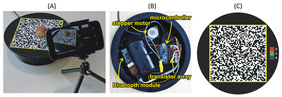 (A) the turntable and smartphone acquisition app in use, (B) inside the turntable base, (C) the 130 × 130 mm calibration pattern on the turntable platter.