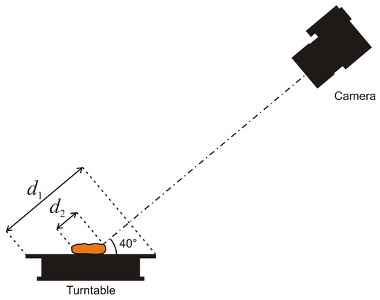 When using the DSLR camera with a 50 mm macro lens at aperture, the camera elevation was approximately 40° and the object-to-camera distance was 550 mm. Assuming a circle of confusion of 20 , and applying the calculations detailed by Kraus [29], the depth-of-field would be 98 mm. Referring to Figure 4, the width of the calibration pattern is 130 mm, which, when viewed at a 40° angle, reduces to a depth of . This would suggest that the depth-of-field is barely adequate for this application, especially given that the aperture would be expected to introduce diffraction blurring of approximately 10 [29]. However, given that the average dimensions of the objects of interest are 43 mm by 51 mm [9], giving , the depth-of-field has proven to be sufficient in all practical cases.