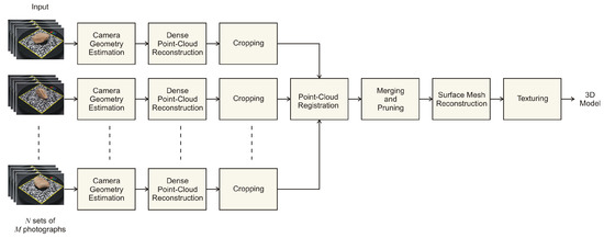 Transforming the sets of photographs into the resulting 3D models consists of several processes as illustrated in the block diagram in Figure 5. During acquisition, M photographs are taken for each of N artefact orientations. The subsequent processing produces a photographically textured, high-precision 3D model using a completely automatic and unsupervised workflow as described in the following sections.