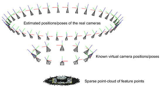 Results from the estimation of camera properties and geometry. Estimated camera positions and poses are shown for the real and virtual/reference cameras. The sparse point-cloud formed from the feature points used for matching is visible at the bottom of the figure.