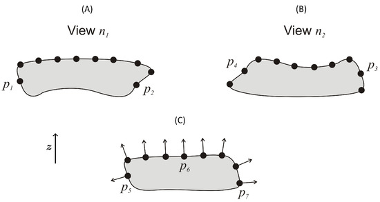 The ICP algorithm in this form works under the assumption that all points in both point-clouds are equally precisely estimated, which, in our application, is not necessarily the case. Figure 7A,B illustrate the problem, showing two partial models of an object acquired from different viewpoints. Assuming view was photographed using a typical camera elevation of around 40°, the points and would have been photographed from a very shallow grazing angle and would be poorly illuminated by the overhead light source. As a result, their photogrammetric reconstruction would not have been as precise as the other points illustrated in the model. From viewpoint (the same object turned over), the corresponding points and would be better illuminated and in better view from the camera and, so, would be more precisely reconstructed.