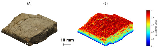 (A) a reconstructed dense point cloud acquired from a cuneiform tablet fragment (U 30056) after the automated cropping process; (B) the corresponding confidence metric of each point.