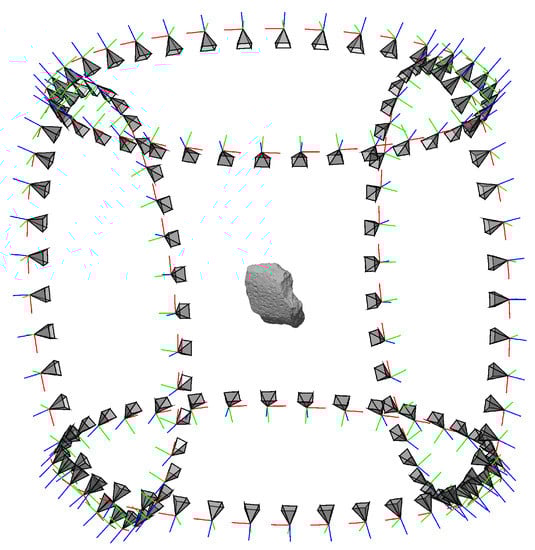 The starting point of the process is the set of camera locations estimated by the bundle adjustment processing of VisualSFM [42]. The position of the m-th camera during the n-th partial acquisition can be expressed in the form of a single 4-by-4 view-matrix, .