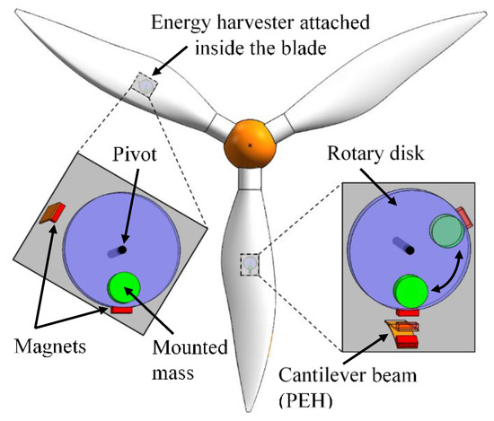 The harvester studied in this paper can be installed on a large scale rotating object (e.g., inside wind turbine blade) to convert its kinetic energy to vibration and electrical energy. In a normal operation of a wind turbine (as shown in Figure 1), for example, the disk orientation is toward the ground due to gravity while the cantilevered harvester (PEH) follows the blade orientation. This setup generates relative motion between the disk and the PEH, and vibration of the cantilevered PEH due to the magnetic force between the disk and the beam.
