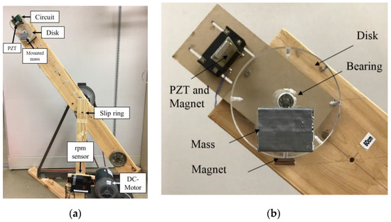 The harvester studied in this research consists of a cantilevered PZT beam (PPA-2011, MIDE corporation, MA, USA) with a tip magnet (BC84, K&J Magnetics, Inc.), and a rotating disk with another magnet as illustrated in Figure 1 and Figure 2 [15,33]. The material properties of the piezoelectric cantilever are presented in Table 1. The disk diameter used in this paper is approximately 15 cm, but is exaggerated in Figure 1 for a better understanding of the mechanism. The test setup in Figure 2 is composed of a wooden plate (replicating a small wind turbine blade, about 1.2 meter long), a DC motor for blade rotation, a slip ring for acquiring the electrical signals from the PEH on the blade, and rpm sensor for measuring the blade rotation speed. The blade speed is set to 10 rpm, which is a typical rotation speed of the wind turbine blade.