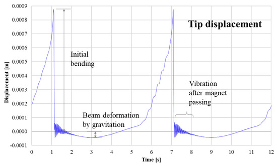 Structural response of the piezoelectric energy harvester (PEH) beam (tip displacement) at 10 rpm.
