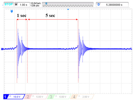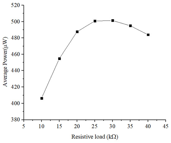 Before connecting the PEH to the power management circuit, the PZT cantilever is directly connected to an adjustable resistive load where the average power is measured. The time history of the voltage measured at the resistive load is shown in Figure 5. One voltage generation cycle is composed of two parts: The output voltage generation period for 1 s and the rest period for 5 s. These durations correspond to the PEH beam vibration right after magnetic impact for about 1 s and the rest for 5 s in Figure 4. The average power of PEH versus load resistance is shown in Figure 6 that finds the optimal PEH resistance at 30 kΩ and the average power as 0.501 mW. Understanding intermittent power generation mode of the PEH as well as power charging efficiency depending on impedance, there is a need for smart power management circuit to effectively charge the energy.