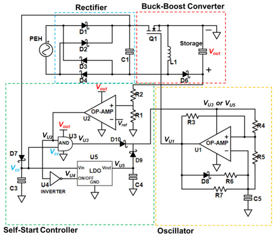 The proposed circuit consists of a full-bridge rectifier, a buck-boost converter, a self-start controller, and an oscillator as shown in Figure 7. Especially the self-start controller is designed to minimize the power consumption of the circuit by (1) self-start, (2) control of the operation mode (active and sleep modes), and (3) switching the power supply to the oscillator between PEH and storage device. The oscillator is used for driving the buck-boost converter that matches impedance.