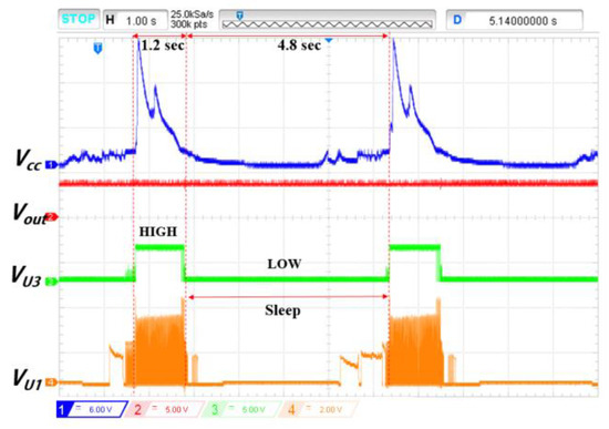 After one cycle of power generation, Vcc becomes smaller than the threshold, and the output voltage of AND gate VU3 becomes LOW to stop supplying power to the oscillator. Then, the circuit enters the sleep mode for 4.8 s to save power. The experimental results show that the proposed self-start controller successfully controls the circuit to minimize the power consumption of the circuit.