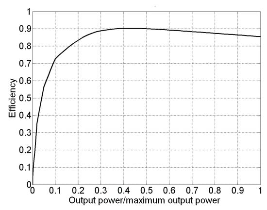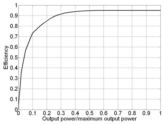 The curve of Figure 1 was constructed by considering typical efficiency profiles of commercial inverters, in which the efficiency usually degrades at low output power levels because of switching and conducting power losses in the circuit elements of the inverter [17,18,19].