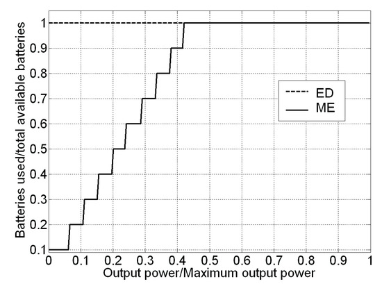 As it can be easily understood, the two strategies are almost equivalent for power levels comprised in the range 40%–100% of the maximum output power of the system, because they tend to use the same number of batteries for these power levels. However, the ME strategy performs significantly better than the ED one for power levels up to the 40% of the maximum output power, allowing fully exploiting the system capabilities in terms of energy efficiency.