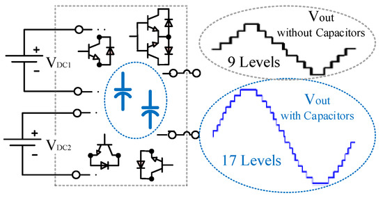 The general concept diagram of the proposed multilevel inverter (MLI) with capacitors.