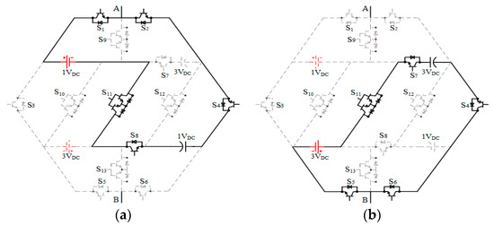 The charging paths of capacitors in the P-Type module, (a) charging for 1Vc; (b) charging for 3Vc.