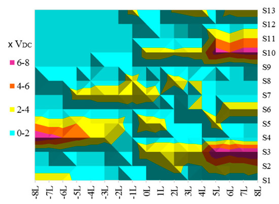 According to Figure 3, the maximum magnitude of the blocking voltage was considered for each power switch. The total of all switch blocking voltages was introduced as TSV. The voltage standing on the switches in each level and the circuit study are presented in Figure 6 and Figure 7, respectively. For each level, the voltage standing on each switch was separated by different colors, as shown in Figure 6. Low purple parts in Figure 6 confirms that the voltage stresses on switches were rare, and most of the area had low switch stress in the levels. Figure 7 demonstrates the voltage of switches on the circle graph, showing that the voltage standing in comparison with the total standing voltages was low in S1, S2, S5, S6, S7, S8, S9, S11, S12, and S13.