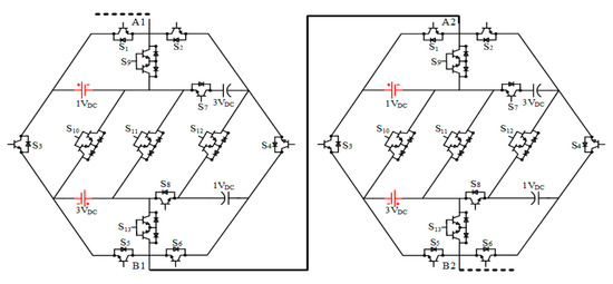 The modularity of the proposed model led to achieving more voltage levels. The cascade configuration was attractive for the medium and high voltage applications with cumulative DC links, such as solar Photovoltaic farms. The cascade connection of the two sequential units is shown in Figure 8. In this configuration, the unit produced 0, ±1VDC, ±2VDC, ±3VDC, ±4VDC, ±5VDC, ±6VDC, ±7VDC, and ±8VDC.