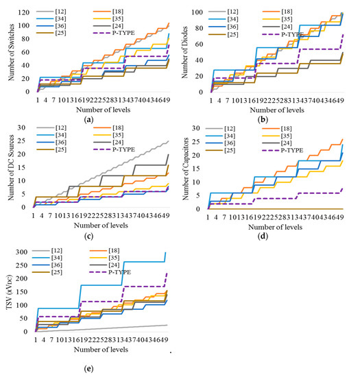 Comparative studies: The number of switches (a); The number of diodes (b); The number of sources (c); The number of capacitors (d); and TSV (e) in terms of the number of levels.