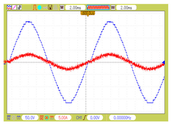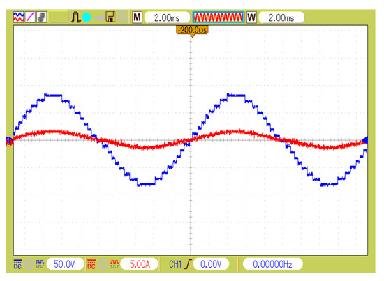 The experimental test on the setup system was performed, and each step of the voltage was considered 10 volts. Thus, the values of the used DC voltage sources were 10 (V) for 1VDC and 30 (V) for 3VDC in which ±8xVDC and ±16xVDC were generated for one module and cascade connection, respectively. The 17 levels and 33 levels MLI supplied the load with 40 Ω. Figure 14 shows the 50 Hz voltage and current sinusoidal waveforms of the proposed module for 17 levels. It should be mentioned that THD was 3.77% for 17 levels in the experimental test. Figure 15 contains results for 33 levels whose THD was 1.97%. The components were reduced directly affect the manufacturing cost. The new proposed multilevel inverter with a reduced number of DC sources was economical, and the smooth output voltage with low harmonic waveform made P-Type an interesting multilevel.
