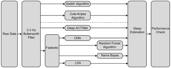 The Kripke algorithm is a traditional sleep estimation algorithm that was proposed by Cole et al. [13]. It can distinguish asleep states from awake states automatically using movement information from a wristband accelerometer sensor system. Using the fifth order Butterworth filter, The accelerometer data were filtered into 2–3 Hz. After the filtering process, the activity count was calculated. There are several methods for the estimation of the activity count, including MAXACT, SUMACT, zero-crossing mode (ZCM), time-above-threshold (TAT), and proportional-integrating mode (PIM) [13,36,37]. According to a recent study [38], the PIM activity count method, compared to the other methods, yields the highest accuracy performance. This procedure was then followed by the feature extraction, wherein the extracted features are summated after their own predefined weights are multiplied. If this value exceeded a threshold, the sample was considered to be in an awake state. If not, it was considered to be in an asleep state.