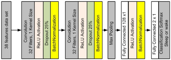 Figure 4 illustrates the structure of the 1D CNN receiving data in 38 × 1 dimensions as an input. Thirty two filters with a 1 × 1 kernel size were applied for the first two layers, which produced a 38 × 32 feature map by the convolution of the input data, and the same process was implemented in the second layer. A pooling layer with a kernel size of three was employed with a stride of three to prevent overfitting issues after the convolutional processes, where the output of this layer was a feature map with size 12 × 32. A fully connected layer was used to make high level feature vector for the sleep staging from the output of the previous layer. The softmax was utilized as an activation function for the final classification of the sleep stages. Algorithm 1 is the pseudocode of the CNN example implemented in this simulation. This architecture employs dropout and batch normalization to solve the overfitting problem and accelerate data processing. During the learning process, a 0.001 learning rate with 20 epoch and a mini-batch size of 64 were used.